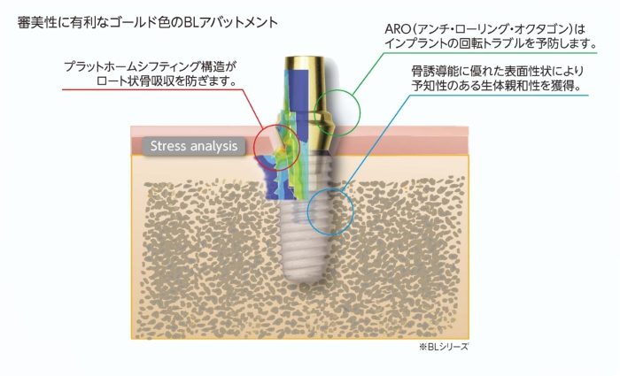 歯科医師、学術医療機関、製造工場の三位一体の下で日本人向けに開発された、安心で信頼できる日本製のインプラント体です。このインプラント体は、ISO9001、ISO13485を取得した設備にて生産され、高品質で信頼性も高いものです。 日本人に合わせた形状で ヨーロッパメーカー製インプラントは、西洋人に適合した規格です。モンゴロイド系アジア人の日本人は西洋人に比べて骨量が少なく、骨質が弱くなっています。このインプラントは、先細りで日本人に合わせた形状になっているのが特徴です。素材強度があり生体親和性の高い純チタンで、従来の1.5倍の強度を持っています。ネジの凹凸を顎の骨に定着しやすくして、骨形成が安定的になっています。 |
